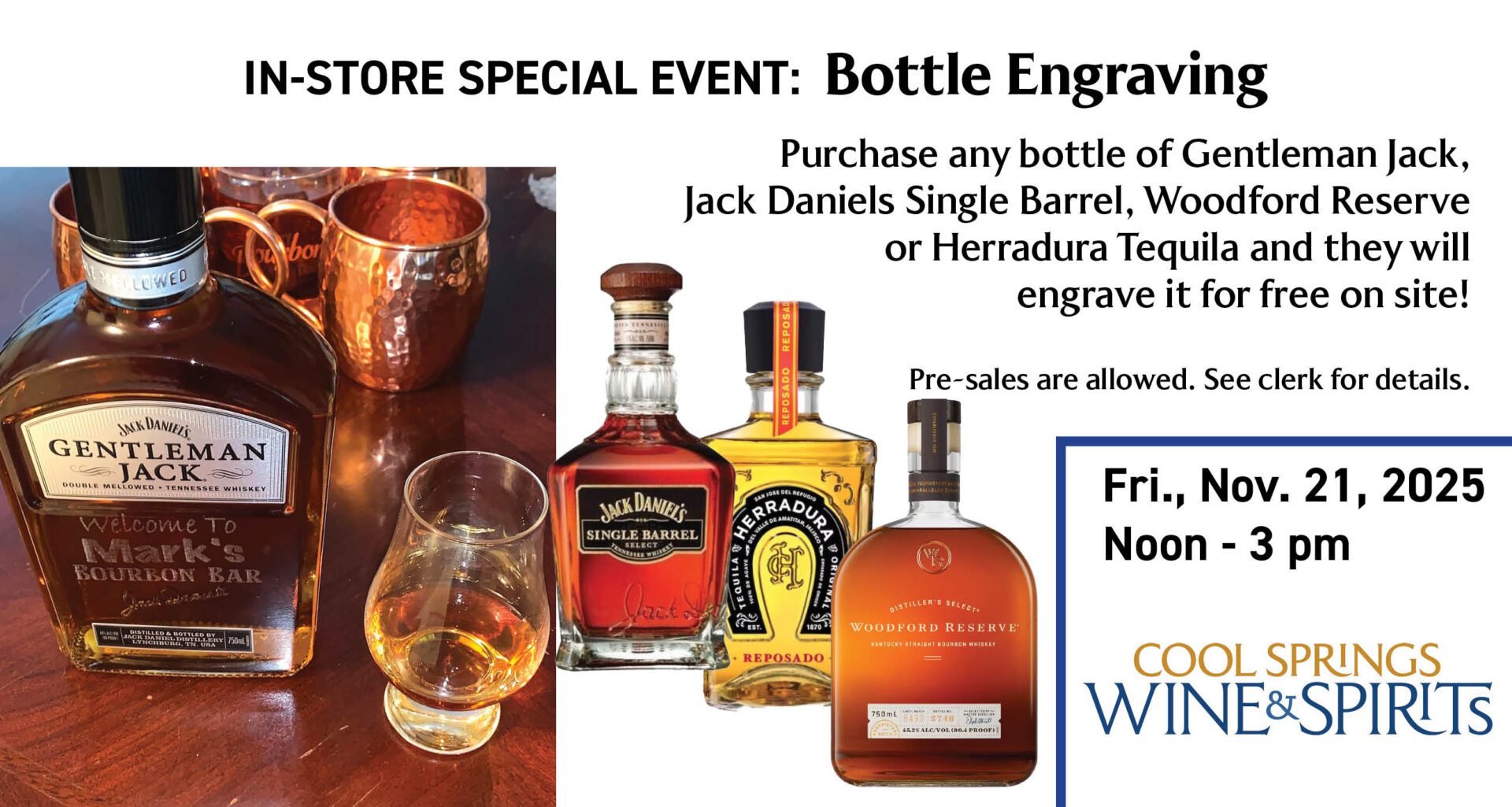 We are delighted to have friends joining us at Cool Springs Wine & Spirits! On Friday, Nov. 21 from Noon-3 pm, we will have folks here sampling Woodford Reserve products – yum!Plus, with the holidays coming up, there will be an engraver on site customizing bottles of Woodford Reserve, Gentleman Jack, Jack Daniels Single Barrel, […]