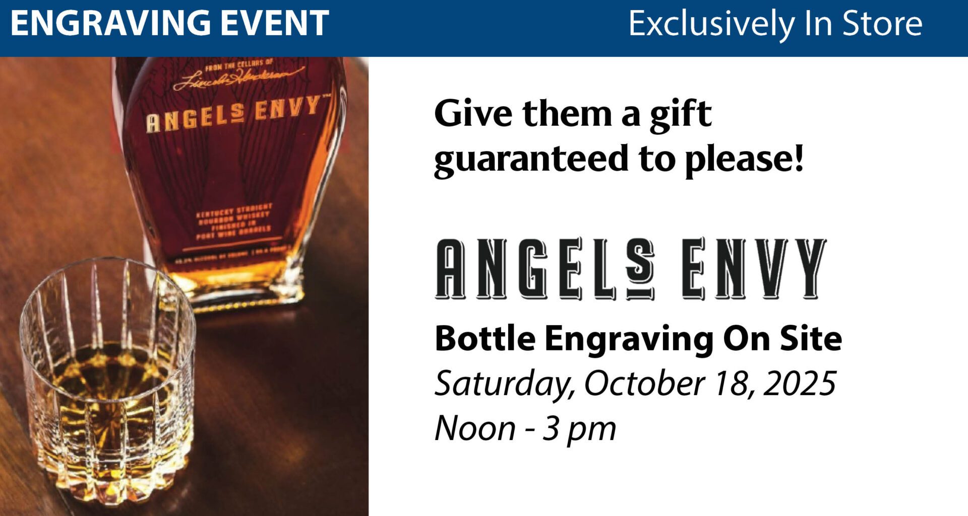 On Friday, November 14, from Noon – 3 pm, friends from Angels Envy will be in-store sampling as well as engraving bottles purchased.What a great holiday gift idea! Sorry, due to capacity issues, this is only available for bottles purchased that day. No pre-sales or prior purchases are accepted.See you there!