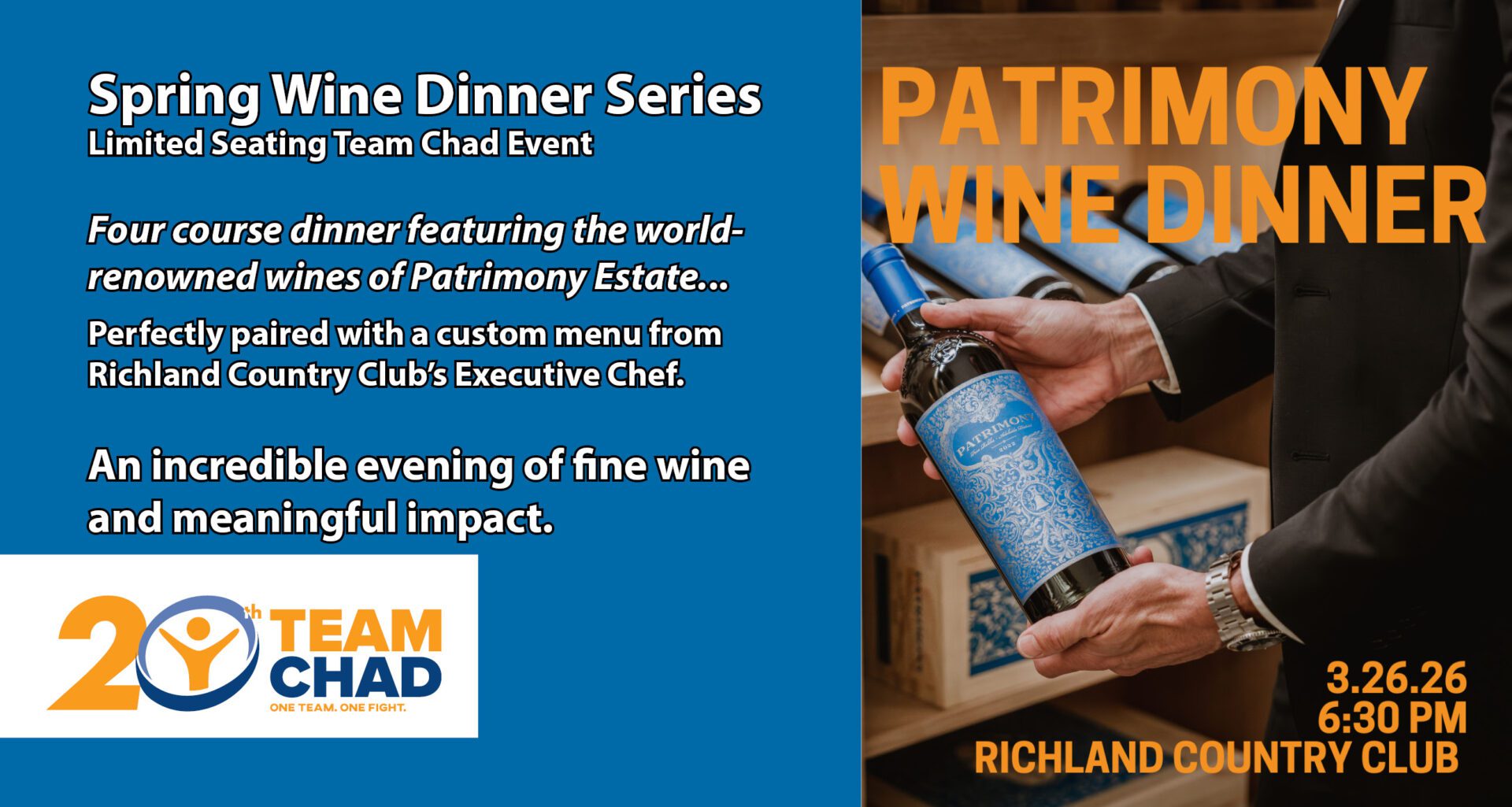 Patrimony Wine Dinner We invite you to join Team Chad this March for a truly exceptional culinary engagement at Richland Country Club. The evening will feature an intimate 4-course dinner featuring the world-renowned wines of Patrimony Estate. The one-of-a-kind tasting experience is a benefit for Team Chad, a 501c3, financially supporting cancer patients and their […]