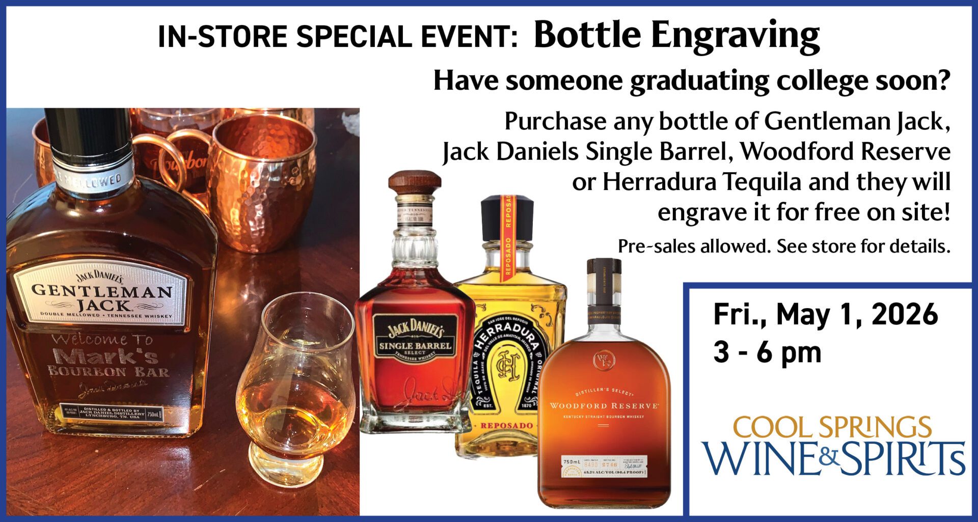 We are delighted to have friends from Brown-Forman joining us at Cool Springs Wine & Spirits! We just bet you might have a college graduate in your life celebrating soon.What better gift than an engraved bottle of their spirit! On Friday, May 1 from 3-6 pm, we will have folks here sampling Jack Daniels products […]