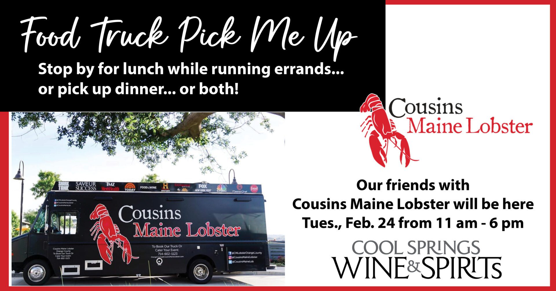 Sometimes in life, you need to be in two places at once.Like out running errands, but also grabbing lunch. Or picking up wine and dinner for the family. Our friends with Cousins Maine Lobster (a staff favorite, for sure!) will be in our parking lot on Tuesday, Feb. 24 from 11 am – 6 pm […]