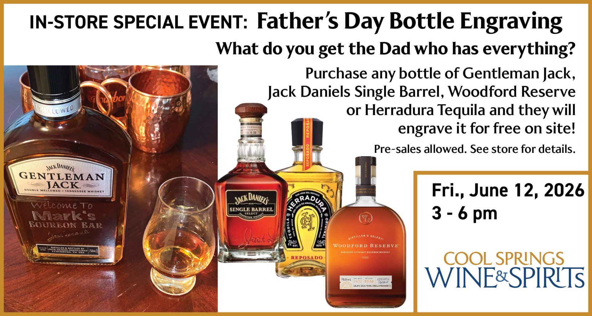 We are delighted to have friends from Brown-Forman joining us at Cool Springs Wine & Spirits! What in the world do you get for the Dad who has everything for Father’s Day?Or maybe there’s just someone celebrating a birthday, wedding, or other milestone that needs to be commemorated.What better gift than an engraved bottle of […]
